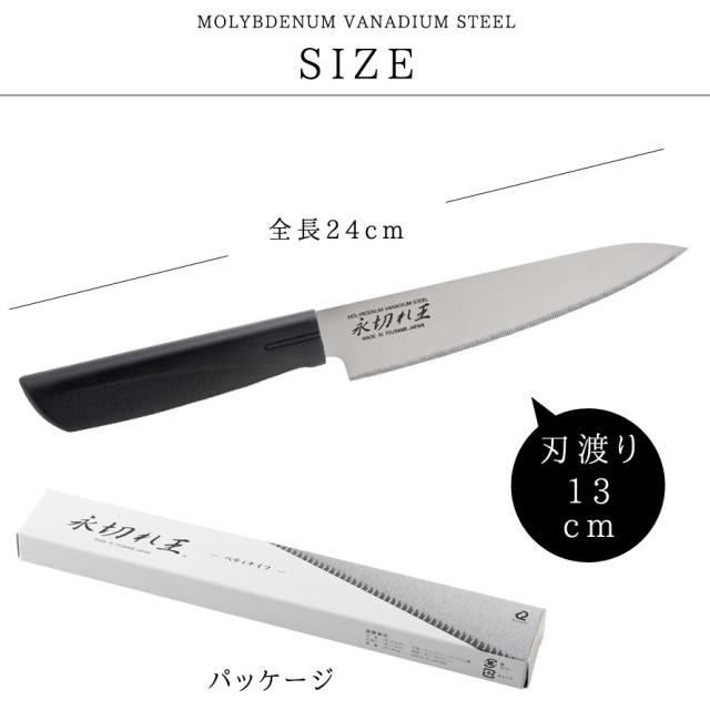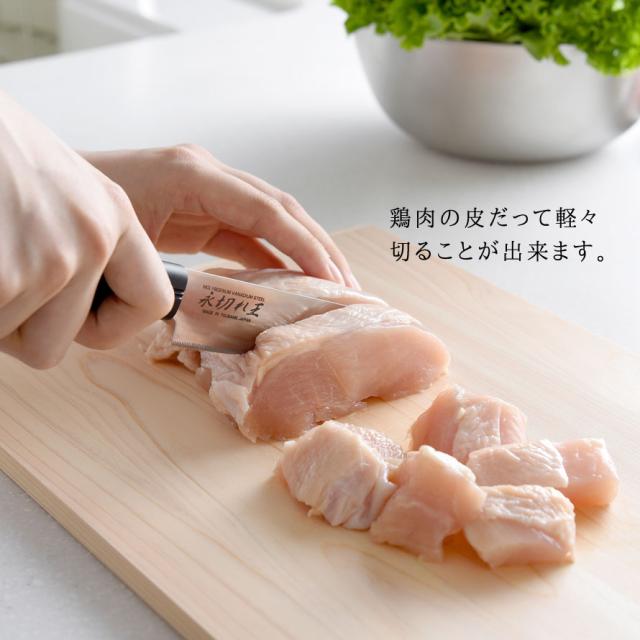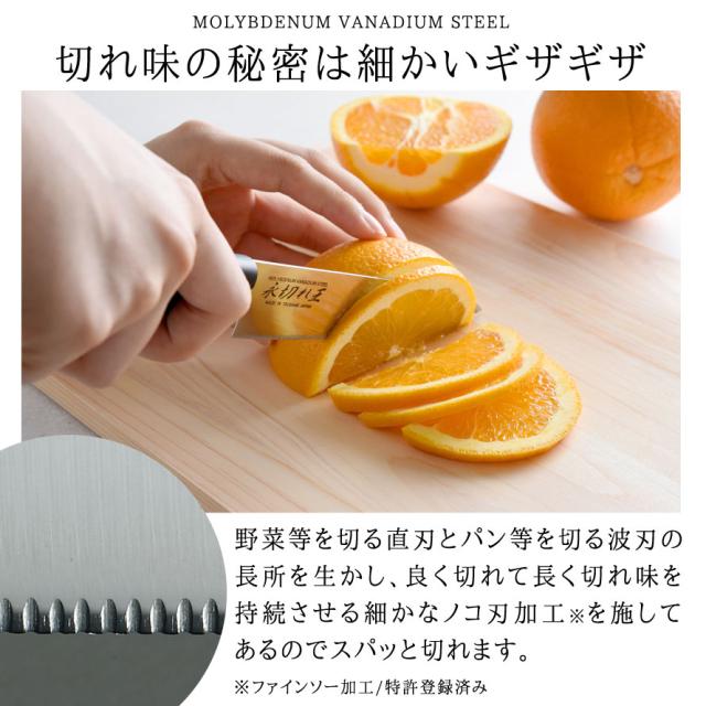 直刃と波刃の長所を生かし、良く切れて長く切れ味を持続させる細かなノコ刃加工(ファインソー加工/特許登録済み)を施した特殊刃で魚もバラ肉もスパッと切れます。小ぶりで小回りのきくペティナイフ。