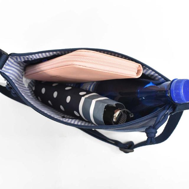 A5サイズがぴったり入り、身軽に使える収納力。薄マチのサコッシュですが、500mlペットボトルも横向きに収納できます。内側にはメッシュファスナーポケットを備えており、小物の小分けにも対応。軽量で疲れにくく、近場のお出かけや休日のお買い物、旅行のサブバッグにもおすすめです。