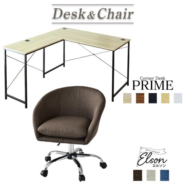 パソコンデスク デスク PCデスク L字型 コーナー 木製 オフィスデスク オフィスチェア 上下昇降 肘付き 360度回転 高さ調節 キャスター付き プライム エルソン
