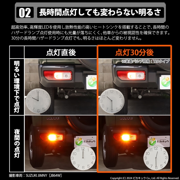 長時間のハザードランプ点灯使用時にも光量が落ちにくく、他車からの被視認性を確保できます。30分の長時間ハザードランプ点灯でも、明るさはほとんど変わりません。
