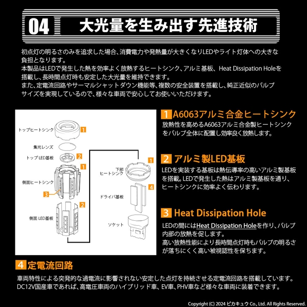 LEDの間にはHeat Dissipation Holeを作り、バルブ内部の放熱を促します。高い放熱性能により長時間点灯時もバルブの明るさが落ちにくく高い被視認性を保ちます。