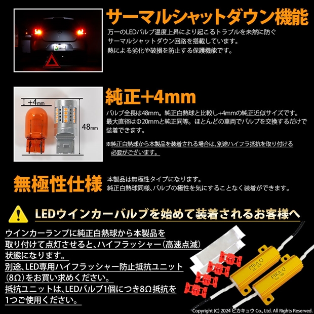 ◆ウインカーランプに本製品のみを取り付けて点灯させると、ハイフラッシャー(高速点滅)状態になります。別途、LED専用ハイフラッシャー防止抵抗ユニット(8Ω)をお買い求めください。抵抗ユニットは、ウインカーLEDバルブ1個につき1つご使用ください。