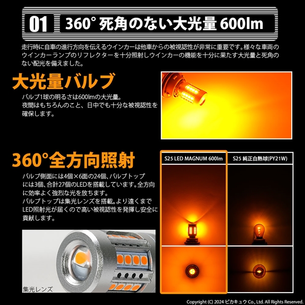 バルブ1球の明るさは600lmの大光量。様々な車両に装着してもウインカーランプのリフレクターを十分照射しウインカーの機能を十分に果たす大光量と死角のない配光を備えています。