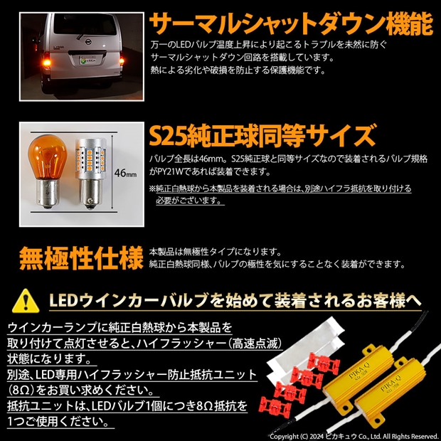 ◆ウインカーランプに本製品のみを取り付けて点灯させると、ハイフラッシャー(高速点滅)状態になります。別途、LED専用ハイフラッシャー防止抵抗ユニット(8Ω)をお買い求めください。抵抗ユニットは、ウインカーLEDバルブ1個につき1つご使用ください。