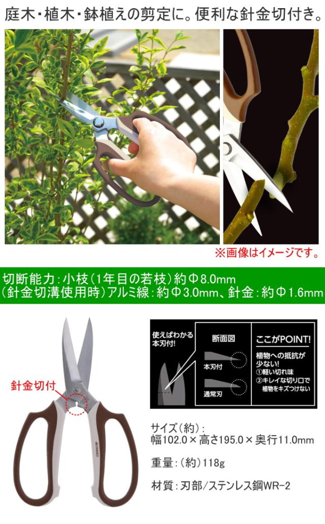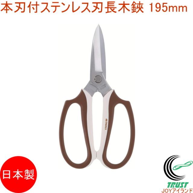 本刃付ステンレス刃長木鋏 195mm 日本製 園芸 ガーデニング 丈夫 剪定はさみ 庭木 植木 鉢植え 針金切り付き ステンレス