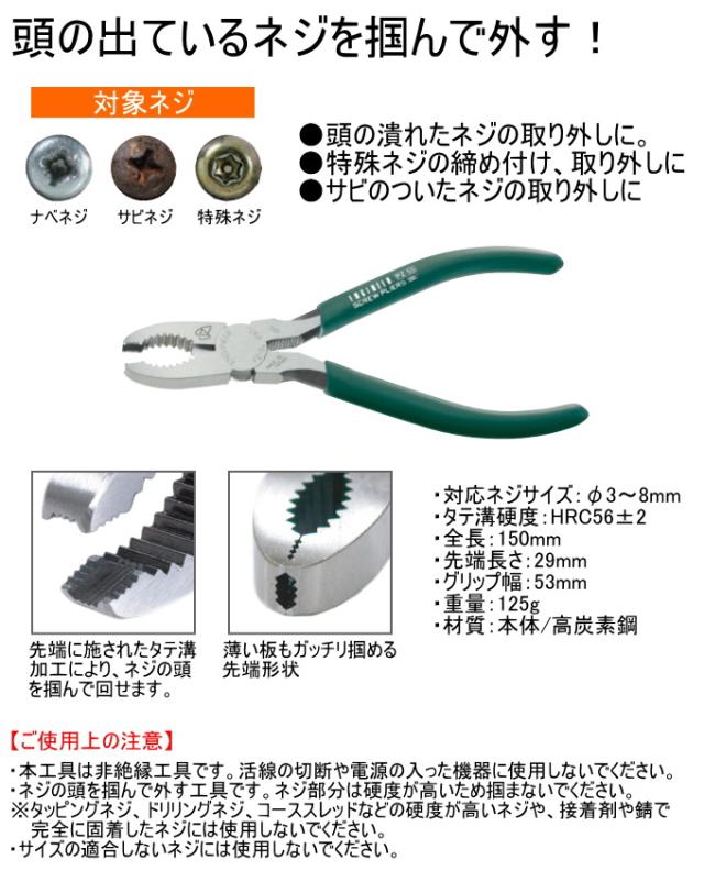 | 特徴 | 潰れたネジ、錆びたネジを掴んで回せるペンチ。 先端で縦に掴めるため、狭い場所でも作業できます。 |