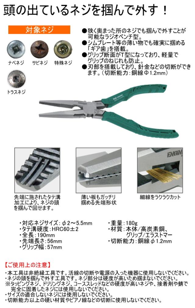 | 使用上の注意 | 本工具は非絶縁工具です。活線の切断や電源の入った機器に使用しないでください。 ネジの頭を掴んで外す工具です。ネジ部分は硬度が高いため掴まないでください。 タッピングネジ、ドリリングネジ、コーススレッドなどの硬度が高いネジや、接着剤や錆で完全に固着したネジには使用しないでください。 サイズの適合しないネジには使用しないでください。 鋼線など硬い線材を切らないでください。 |