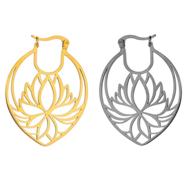 ティアードロップの涙型のフレームに蓮華の花をモチーフにしたフラワートライバルをデザインしたかっこいいステンレスピアス。