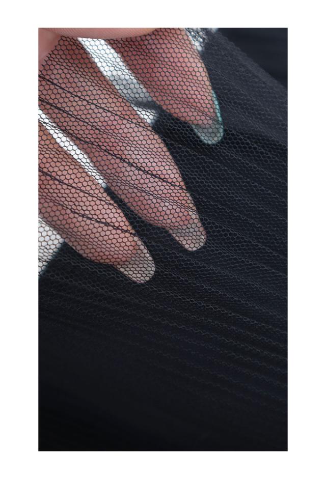 着丈はふくらはぎが隠れるくらいです。肩ひもで長さを調節できます。左のサイドにはプリーツチュールが施されていてアシンメトリーなデザインに心ときめきます。少し伸縮性のある生地でした。