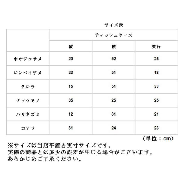 | サイズ | ・ホオジロサメ ・ジンベイザメ ・クジラ ・ナマケモノ ・ハリネズミ ・コアラ ※サイズについて詳細は、サイズ表をご覧くださいませ。 ・対応サイズ 【ホオジロザメ/ジンベイザメ/クジラ】 [縦]約5.5cm × [横]約23.5cm × [奥行]約12cm以下のティッシュボックスに対応。 【ナマケモノ/ハリネズミ/コアラ】 [縦]約5.5cm × [横]約23cm × [奥行]約11.5cm以下のティッシュボックスに対応。 |