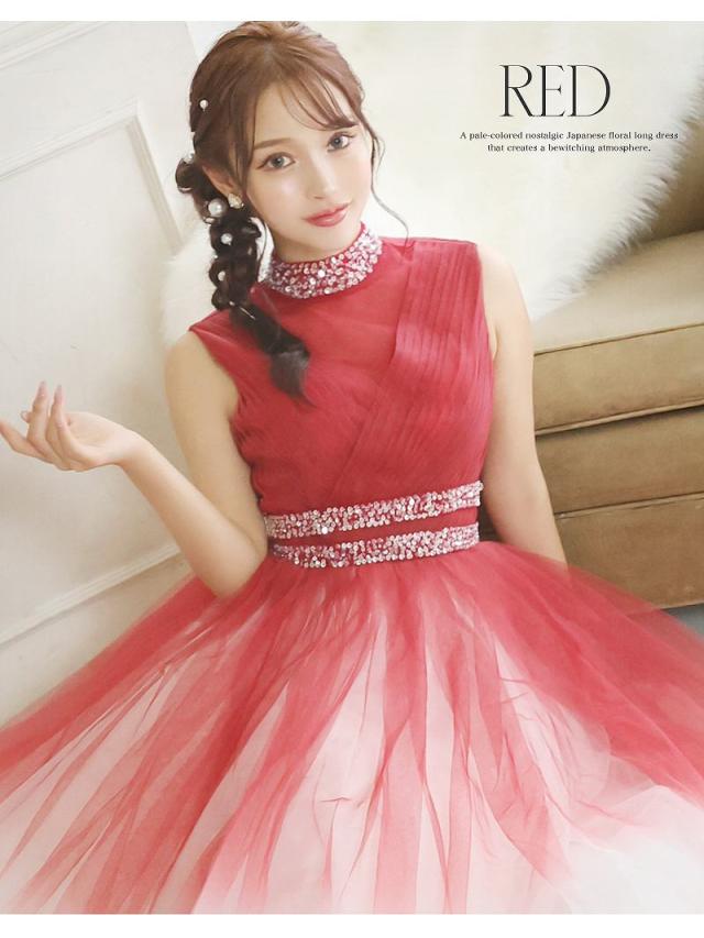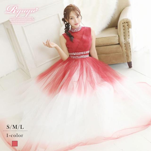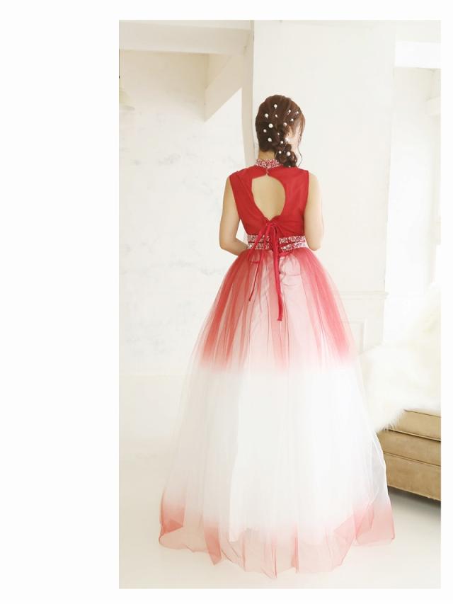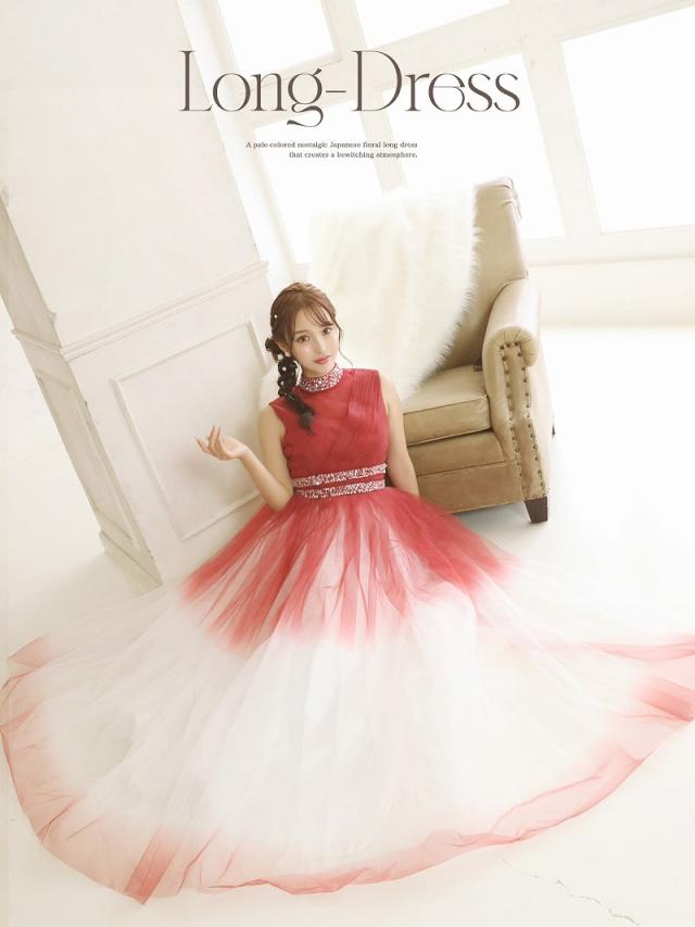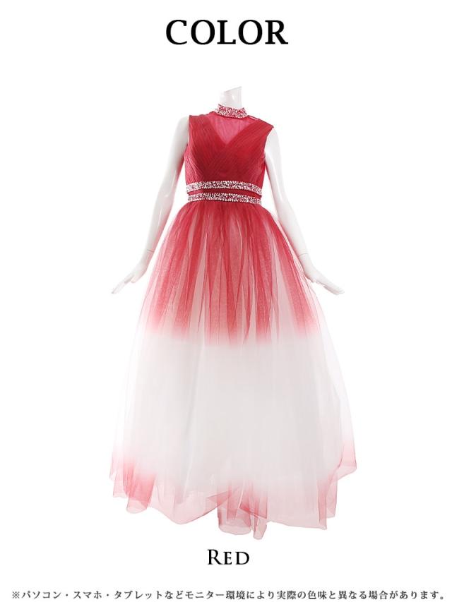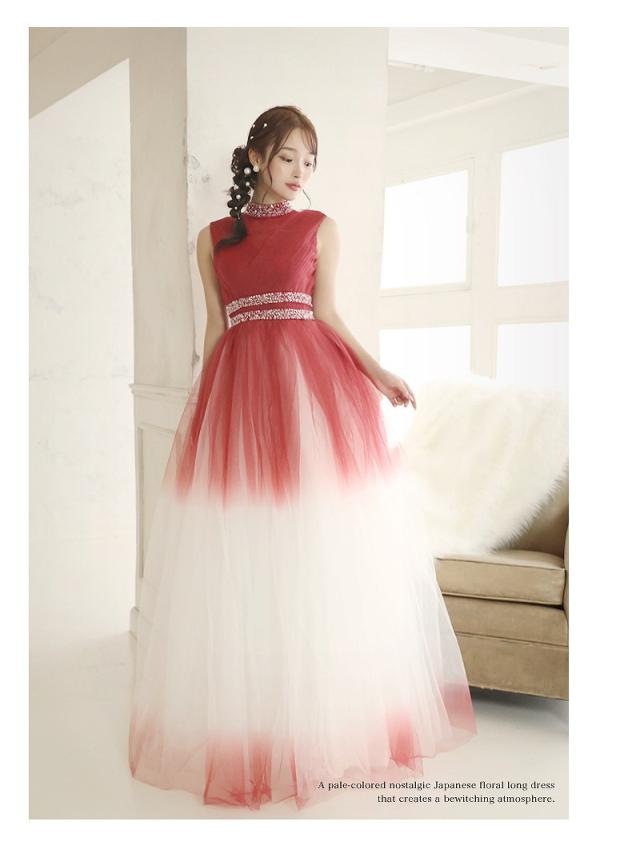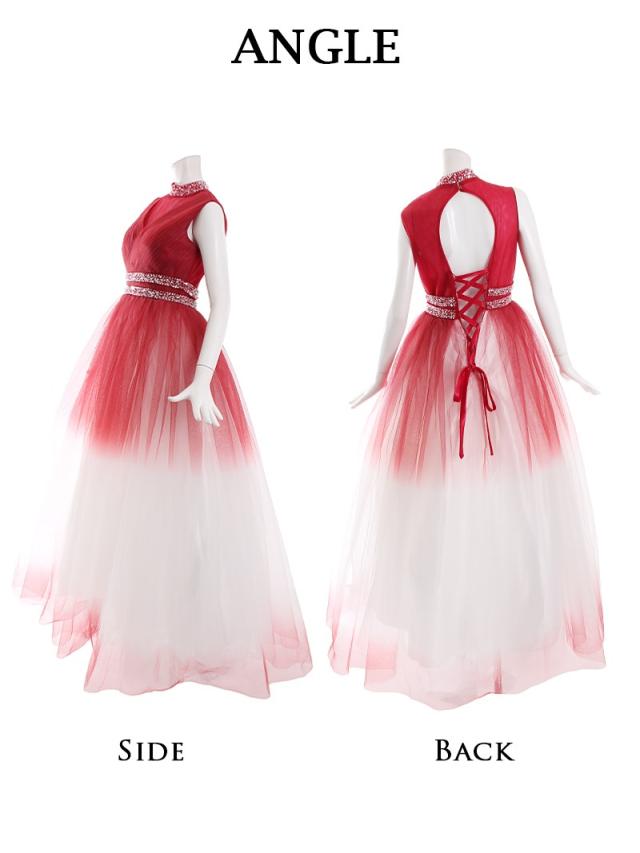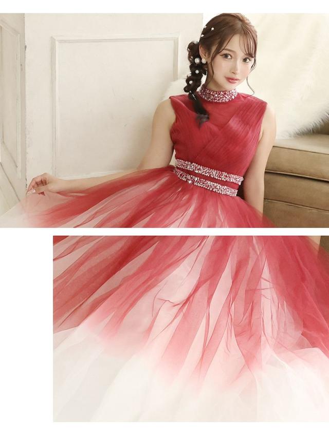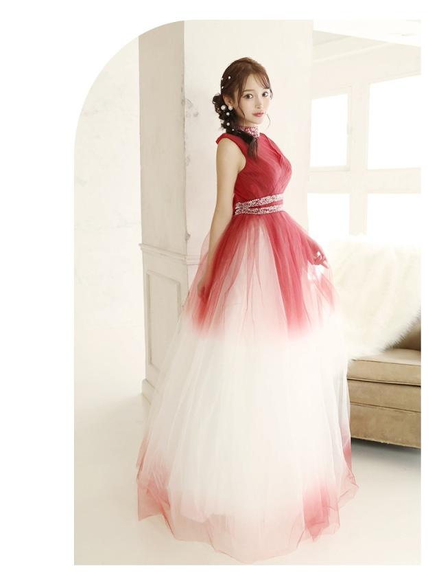 ☆レッドカラーのグラデーションフレアードレスはボリュームのあるスカートとバックスピンドルデザインがプリンセスの様な雰囲気を演出してくれる主役級ドレス♪
