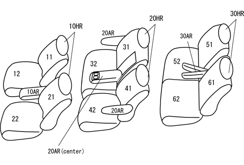ヘッドレスト総数:6 1列目肘掛:1 2列目肘掛:3 3列目肘掛:2 サイドエアバッグ:×