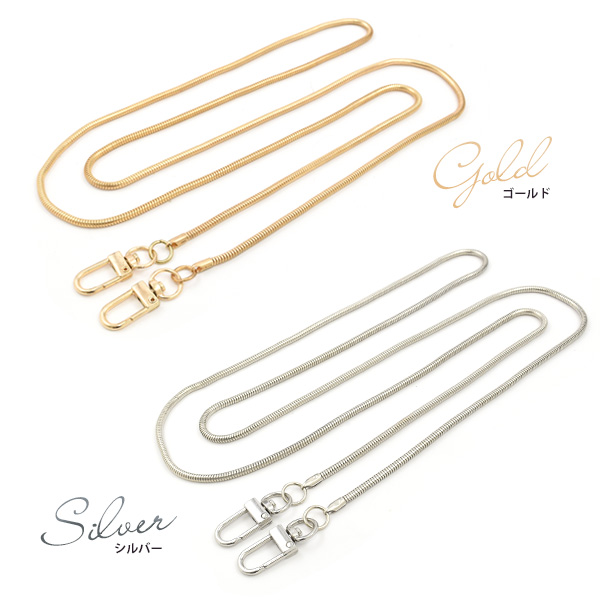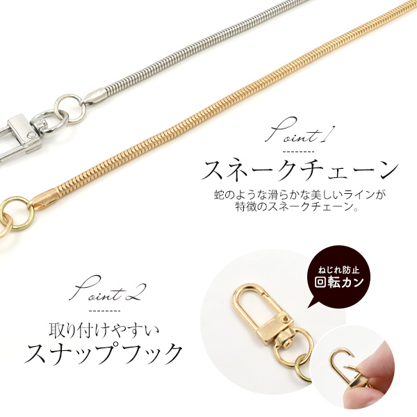 | スネークチェーンは蛇のような滑らかなラインが特徴で、 遠くから見ると紐のように見えるチェーンです。 ショルダーストラップに対応したスマホケースや財布に装着することで 持ち運びに便利なショルダーケース(クロスボディタイプ)として使うことができます。 金具は取り付けやすいスナップフック。 回転カンを使用しているため、絡まりやねじれが起きにくいです。 ゴールドとシルバーの2色展開です。 | ||||||||||||