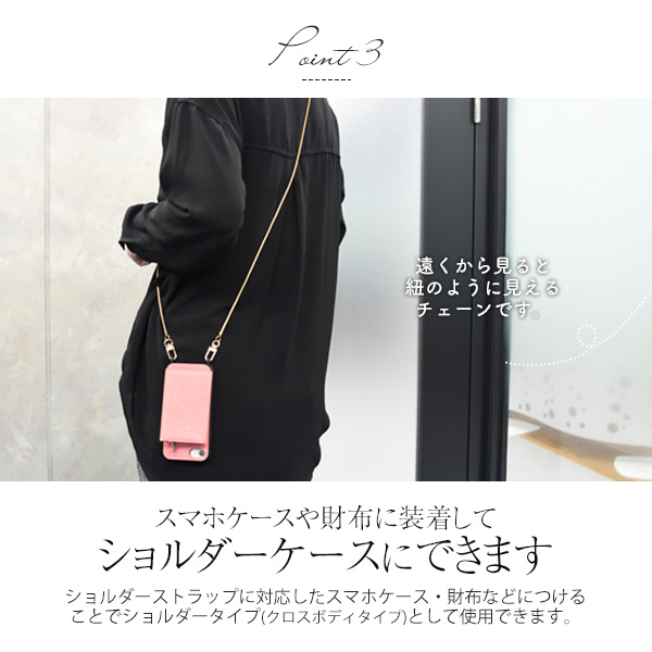 ショルダーストラップに対応したスマホケースや財布に装着することで