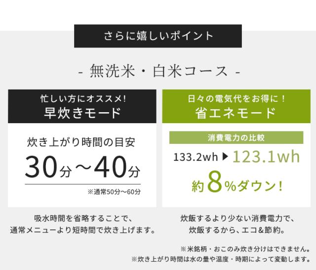 ※1 家庭用品品質表示法にもとづく「電気ジャー炊飯器」の省エネ法関連表示です。蒸発水量は、1回あたりの炊飯時に炊飯器の外に放出した水の質量で、省エネ法の目標基準値を算出するために用いる数値です。白米の省エネメニューで計測。