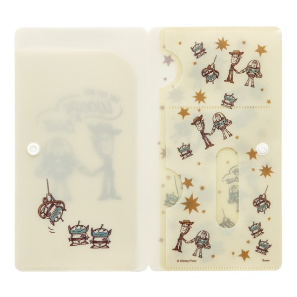 トイ・ストーリーのイラストがプリントされた子ども用マスク3枚とマスクケースのセットです。食事の際に外した使用中のマスクや、マスクの替えを収納できます。ボタンを留めるとカバンの中にスッキリ収まり清潔に持ち運べます。