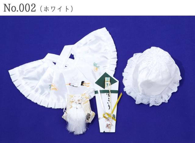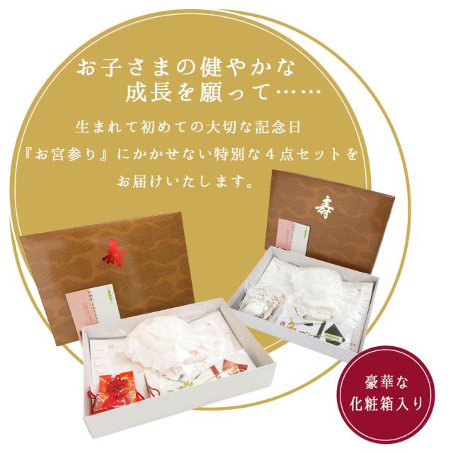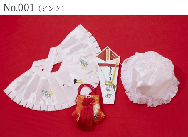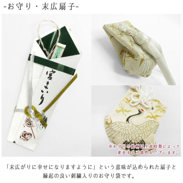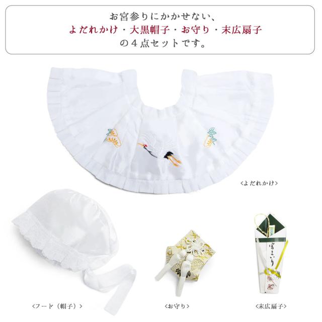 『よだれかけ・フード(帽子)・お守り袋・末広扇子』の4点セット。