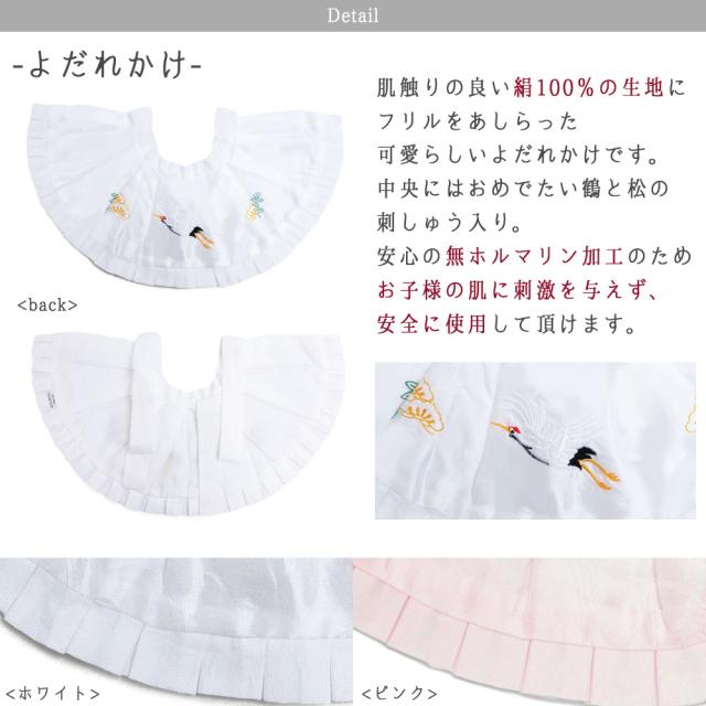 よだれかけとお守り袋には、縁起のいい刺繍が施されており、お子様の健やかな成長を祈願いたします。