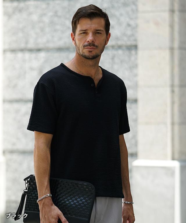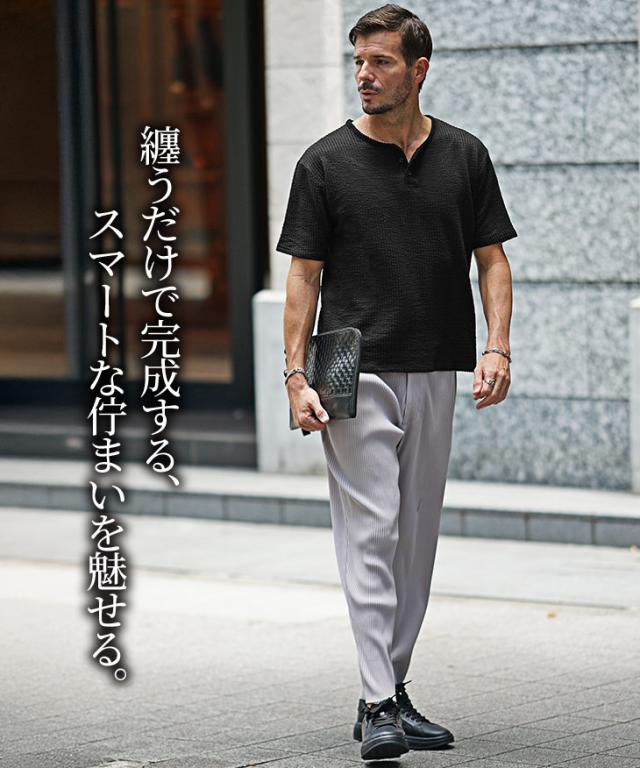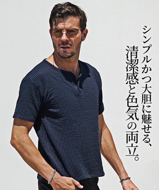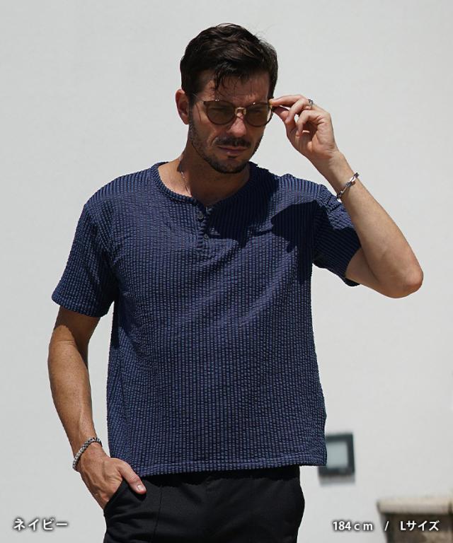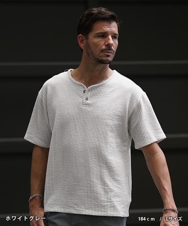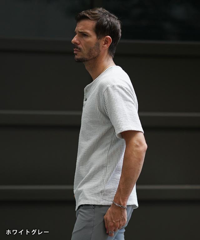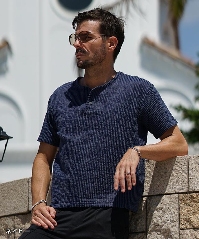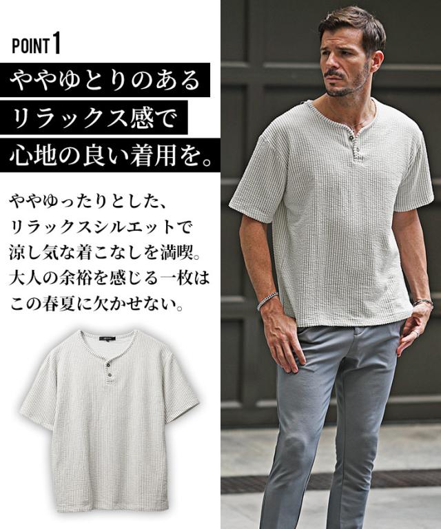 『シアサッカーヘンリーネックTシャツ』大人の余裕と爽やかさを生み出すTシャツが登場。【モテる男は、いつも余裕】モテる男はいつだってどこか余裕を持っている。そして、それは服装にも現れる。ゆとりのあるサイズ感を採用したTシャツは、リッチな大人のOFFを感じる余裕を演出。また、首元はボタン付きのヘンリーネックで胸元に色気をプラス。生地はサ、凹凸感のあるサッカー織の生地を採用することで、肌との接地面を減らし快適で爽快な、着心地からも余裕を。見た目、そして中身から大人の余裕を。※こちらのページは、Tシャツのみの販売ページです。【おすすめコーデ】別売りのハーフパンツと合わせたセットアップでの着用がおすすめですが、デニムと合わせるなど単品でもお楽しみいただけます。