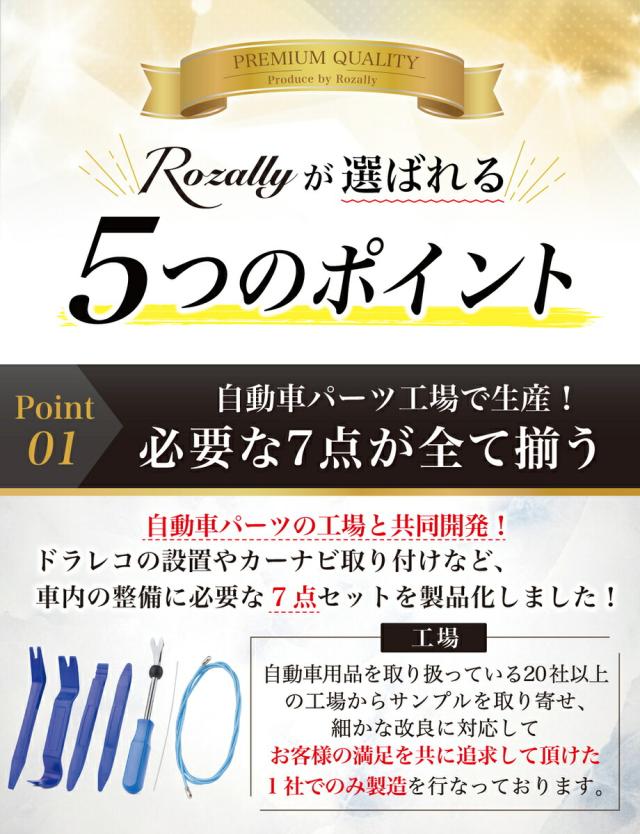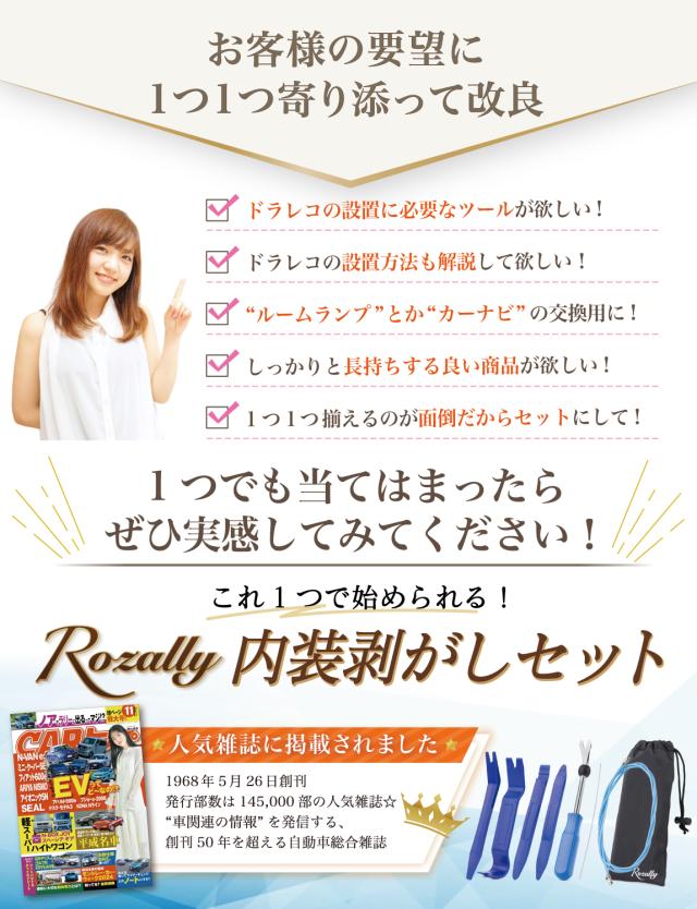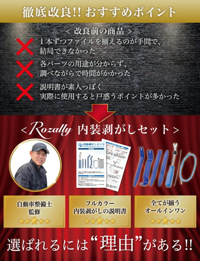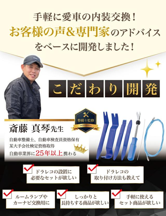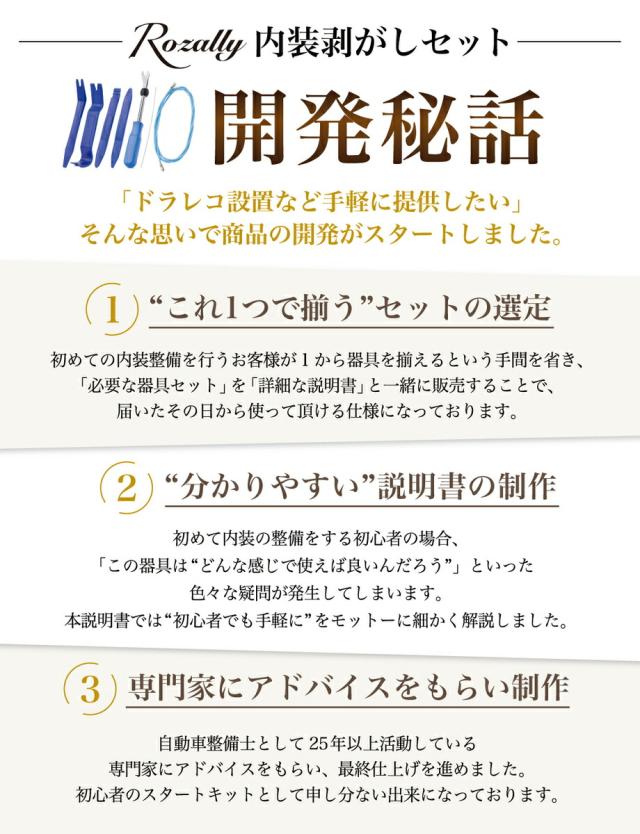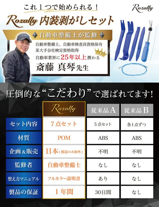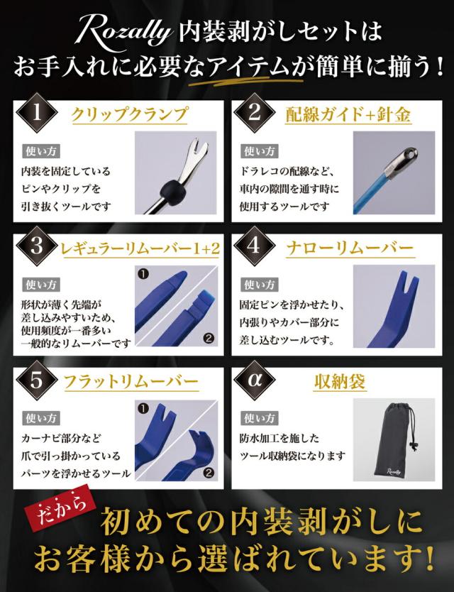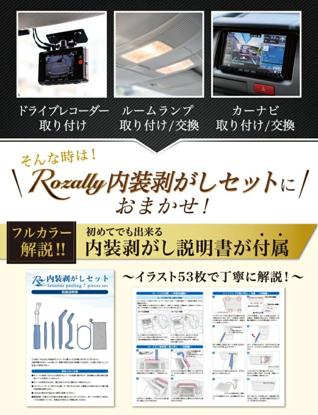 【自動車整備士が監修】車 の 内張剥がし をするときに活躍する”リムーバー”や”配線ガイド”の7点セットです。”ドライブレコーダー”の取り付けや”ルームランプ”,”カーナビ”を交換する時に、周辺の内張りをスムーズに剥がせるように形状の異なるリムーバーを考案して生み出した”内張はがし”のオールインセット。企画&設計では【自動車整備士】からアドバイスをもらい、分かりやすい取扱説明書を添えて企画&開発しました。【こだわり】様々なメーカーから” 内張り剥がし”や” パネル剥がし”としてリムーバーと配線ガイドをセットにした商品が販売されていますが、Rozallyの内装剥がしは”耐久性能”と”使いやすさ”が一味違います。車用内装パーツをメインに取り扱っている10社以上の工場からサンプルを取り寄せ、強度と形状を一緒に試行錯誤して頂けた1社に絞って発注を行なっています。内装はがし としてオールインワンのセットになっている製品になります。