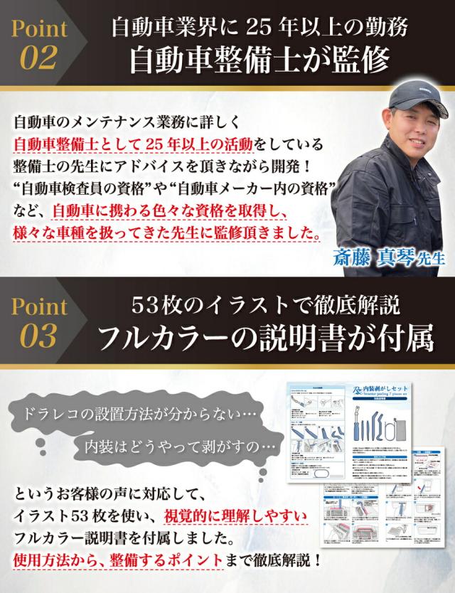 ドラレコを初めて設置するお客様でもスムーズにできるように、 内張はがし の使い方説明書を付属しております。 53枚のイラストを使用して、内張り剥がし を進める上で 迷うポイントを1つ1つ解説しております。 車用の”工具”や”配線”と考えると 結構難しいイメージを持ちがちですが、 初心者でも扱いやすいリムーバーを取り揃えておりますので、 お気軽にお買い求めください。 |