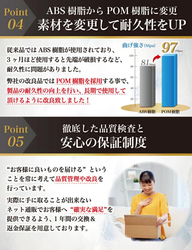 内張りはがし として流通しているリムーバーのメイン素材 ABS樹脂が主流となっています。 しかしABS樹脂では、内装はがし を進める上で 耐久力が足らず”先端の欠け”などを 引き起こすことが多々報告されています。 弊社では素材強度からこだわり”POM樹脂”へと改良することで、 内張りはがし に十分な耐久性を実現致しました。 ”配線止め”に使いやすい針金も付属しております。 |
