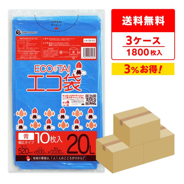 【まとめて3ケース】LN-26-52-3 ポリ袋 20リットル 幅広タイプ 0.030mm厚 青 10枚x60冊x3箱 / ゴミ袋 ごみ袋 送料無料