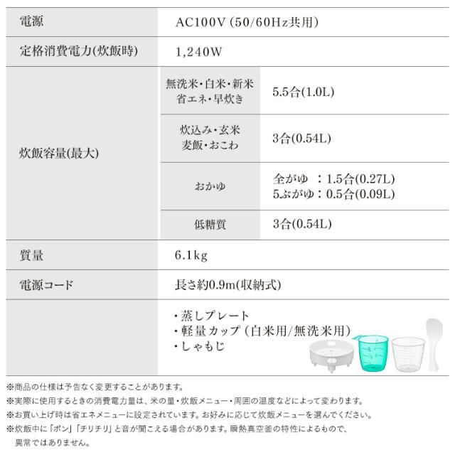 無洗米・白米・新米・省エネ・早炊き:1.0L(5.5合)