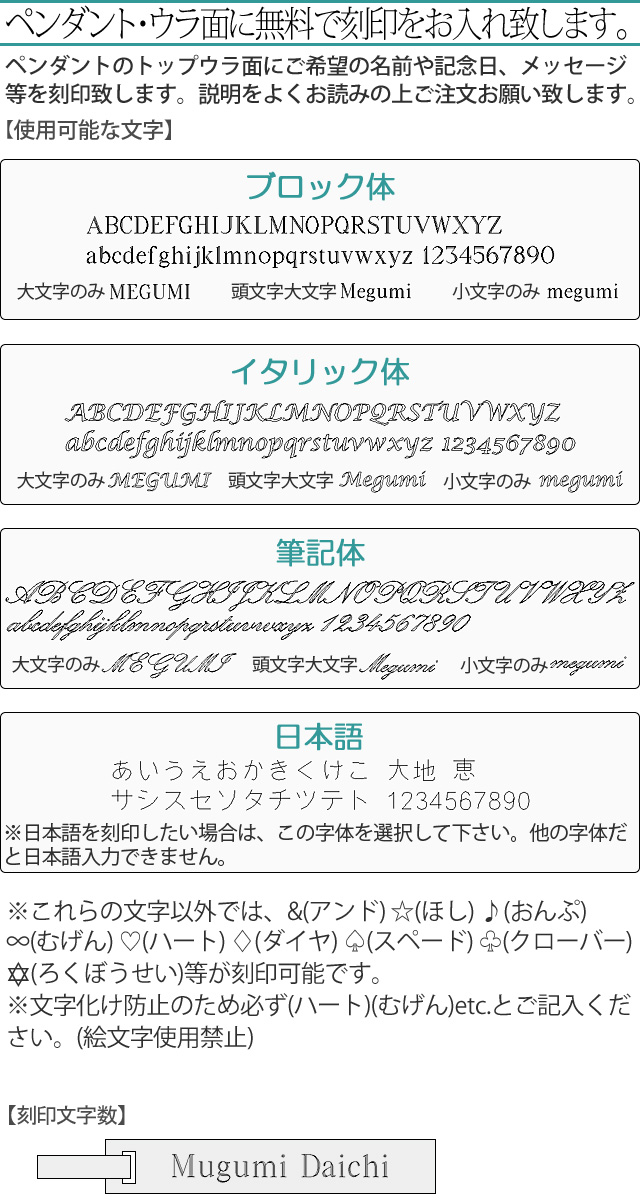 ・刻印文字数はスペース含めて20文字(日本語は14文字)までになります。