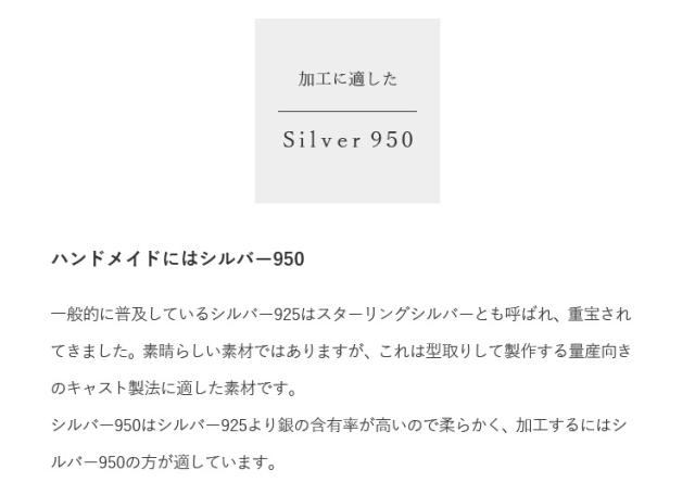 ※シルバー950は、空気中の成分や汗に反応してくすんだり黒ずんだりする性質があります。お使いいただくうちに古びたアンティークジュエリーのように変わっていく色の風合いを楽しむこともできますし、綺麗な光沢を楽しみたい場合は磨き布や研磨剤でお手入れすればピカピカの状態に戻る味わい深い金属です。 個人差はありますが着用始めでは稀にシルバーに接している部分の肌に黒く色をつけることがございますが石けんで水洗いすると落ちます。しばらくお使いになると色移りはなくなります。