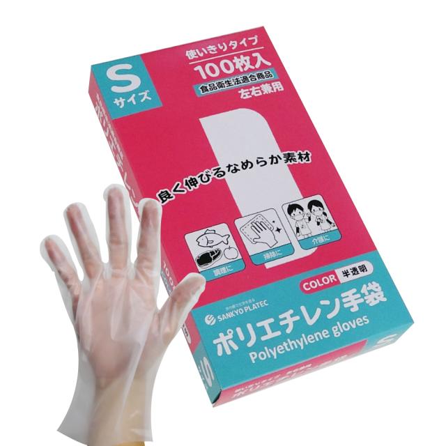 CPE ポリエチレン手袋 Sサイズ 半透明 約22x27.4cm 100枚 HGCNS-100kobako 外エンボス加工 食品衛生法適合商品 左右兼用 使い捨て手袋 衛生手袋 業務用 飲食店 食品調理 介護 清掃 園芸 サンキョウプラテック