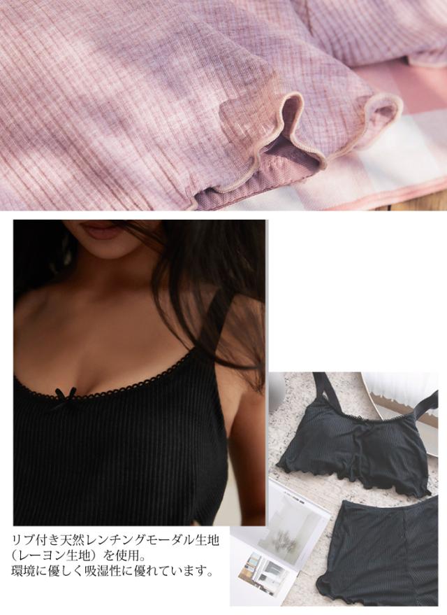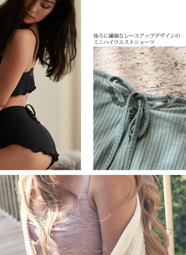 リブ付き美胸ケアブラジャー&レースアップパンツセット。カップの部分は3カット縫いで立体感を作り上げ、胸下のワイドバンドでノンワイヤーでも安定して中央に胸をキープさせます。滑らかな100%天然モーダル素材を使用し肌に優しく、通気性抜群で快適に過ごせます!パッドは取り外し可能。ストラップの部分は光沢がありエレガント。ハイウエストのショートパンツと組み合わせて、自宅でも甘くロマンチック♪
