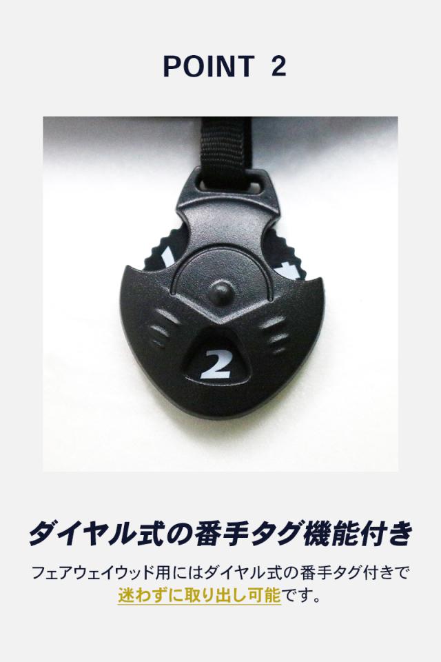 フェアウェイウッド用にはダイヤル式の番手タグ付きで、迷わずに取り出し可能です。