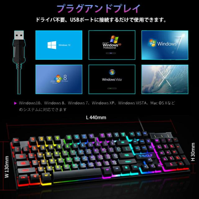 | 英語レイアウトでメンブレンを採用 複数のキーを同時に押した際にもキー入力がスムーズに判定されます。 RGBバックライト付き、暗い場所でもはっきり文字が見やすく、夜間の使用にも適しています。 キーボードは人間工学に基づき、キーに階段状の段差を持たせることで、タイピング時に指にかかる負担を軽減します。 撥水設計なので、うっかり水をこぼしても安心です。 ほこりや汚れに強い。 長期間の使用でも疲れにくい。 ファンクションキーと連動したマルチメディアキーを搭載しています。 再生、停止、進む、戻る操作をキーボード上で素早く操作が可能。 2重成形注入で文字を浮かび上がらせ、文字は色褪せにくい設計です。 |