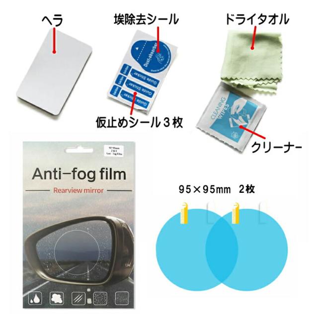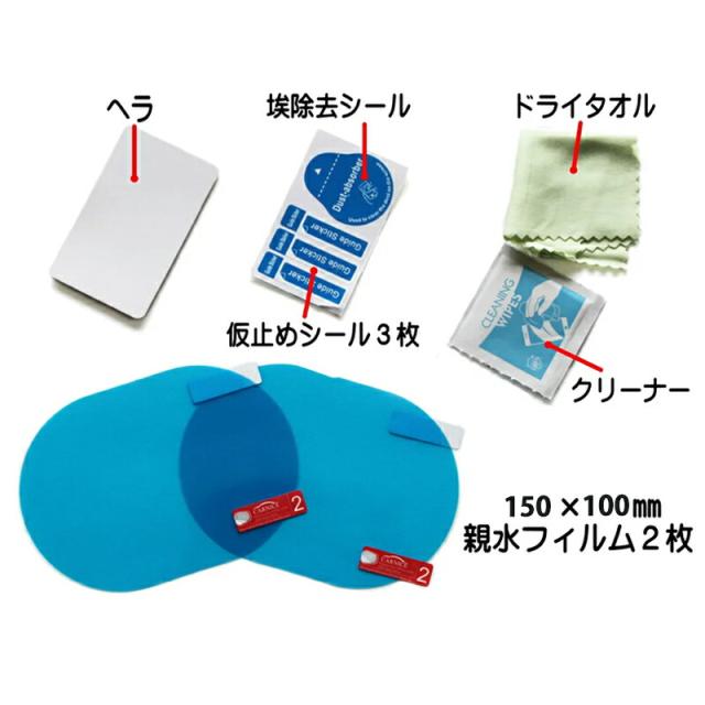 | ドアミラーフィルム×1点(2枚組) 掃除用布×1点 アルコールシート×1点 スクラッチカード×1点 ホコリ取りシール×1点 |