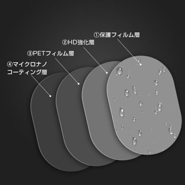 | 保護フィルム層/HD強化層/PETフィルム層/マイクロナノコーティング層で一体成型に作られております。ナノコーティングの分子構造は水分子より小さいため、雨などの水分は内部に浸透出来ず、表面でドロップに成形して撥ねられます。防水、疎油、曇り止め、摩擦防止、光反射防止、グレア防止、防塵、高透過率の8つの性能で、スーパークリアな視界を提供し、安全運転をサポートしてくれます。 【貼り付け方法】 1.付属の掃除用布でサイドミラーをきれいに拭く 2.保護シール(1)をつまんで、裏のシールを剥がす(*粘着面を汚さないように!) 3.サイドミラーにきれいな水を少量に噴水する 4.フィルムを適切な位置に貼付ける 5.気泡が発生する場合がある 6.気泡と水分をスクラッチカードで押し出す 7.表面の保護シールを剥がす 8.貼り付け完成 |
