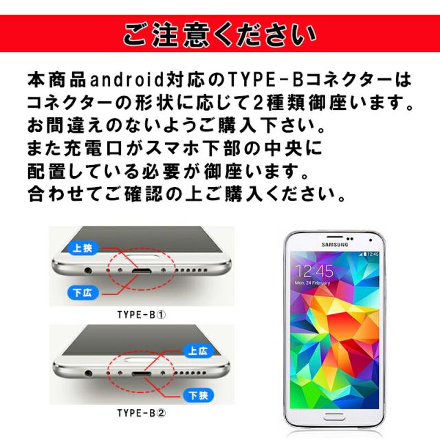 | Lightning ( iPhone用 ) Type-B ( Micro-USB ) Type-C ※Type-Bの差込口にご注意ください。 台形タイプと逆台形タイプをご用意しております。 お使いのスマートフォンのタイプをご確認頂き、適合するタイプをご選択ください。 |