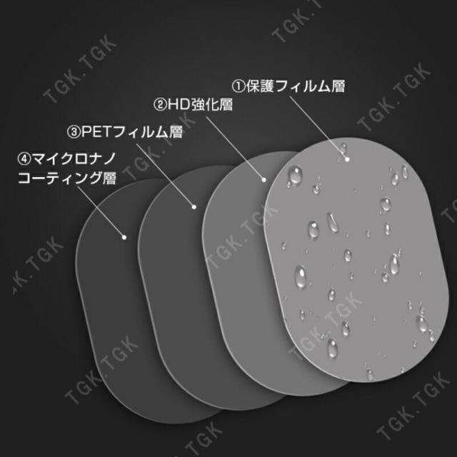 | 保護フィルム層/HD強化層/PETフィルム層/マイクロナノコーティング層で一体成型に作られております ナノコーティングの分子構造は水分子より小さいため 雨などの水分は内部に浸透出来ず、表面でドロップに成形して撥ねられます 防水、疎油、曇り止め、摩擦防止、光反射防止、グレア防止、防塵、高透過率の8つの性能で スーパークリアな視界を提供し、安全運転をサポートしてくれます。 【貼り付け方法】 1.付属の掃除用布でサイドミラーをきれいに拭く 2.保護シール(1)をつまんで、裏のシールを剥がす(*粘着面を汚さないように!) 3.サイドミラーにきれいな水を少量に噴水する 4.フィルムを適切な位置に貼付ける 5.気泡が発生する場合がある 6.気泡と水分をスクラッチカードで押し出す 7.表面の保護シールを剥がす 8.貼り付け完成 |