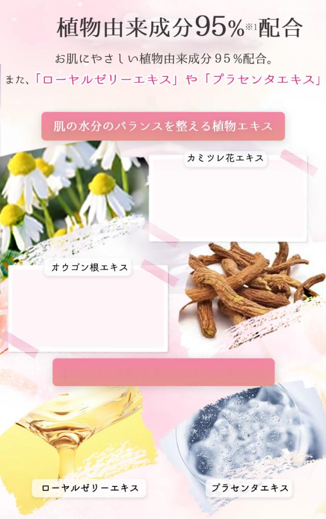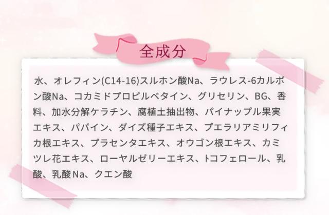 、コカミドプロピルベタイン、グリセリン、BG、香料、加水分解ケラチン、腐植土抽出物、パイナップル果実エキス、パパイン、ダイズ種子エキス、プエラリアミリフィカ根エキス、プラセンタエキス、オウゴン根エキス、カミツレ花エキス、ローヤルゼリーエキス、トコフェロール、乳酸、乳酸Na、クエン酸