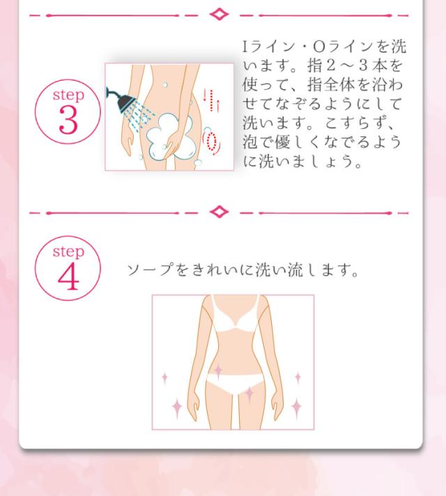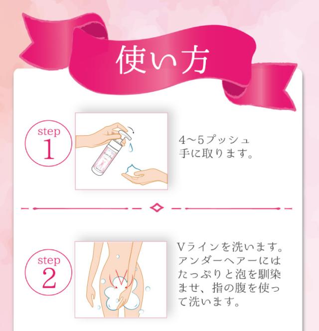 手のひらに4〜5プッシュ程度とり、泡でデリケートゾーン及びアンダーヘアを包み込み、やさしくマッサージするように洗ってください。その後はしっかり洗い流してください。