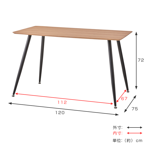 シンプルなスチール製の脚と温かみのある木目調の天板の組み合わせで、ダイニングルームがまるでおしゃれなカフェのような空間に。幅120cmなのでコンパクトサイズの4人用です。
