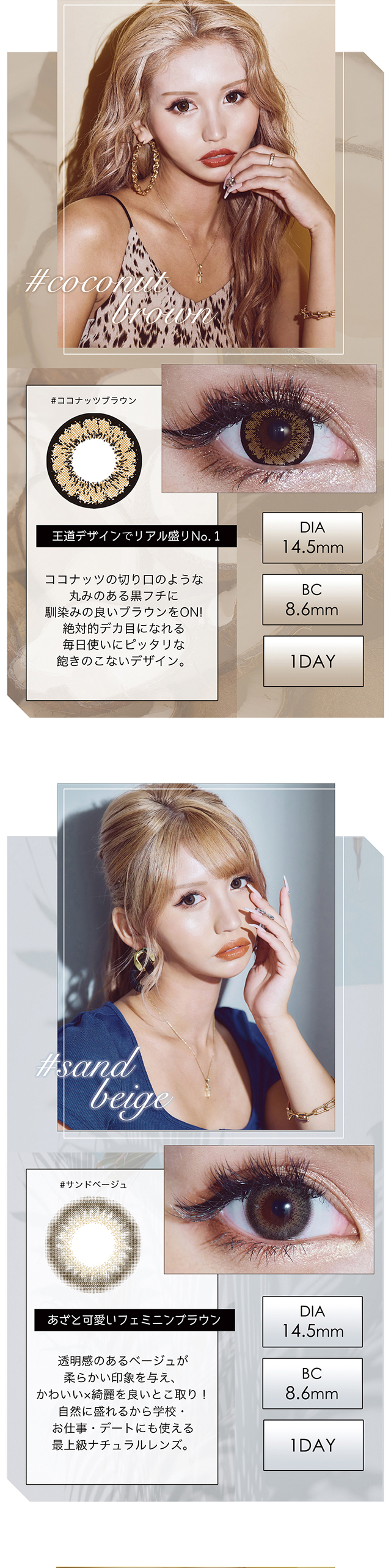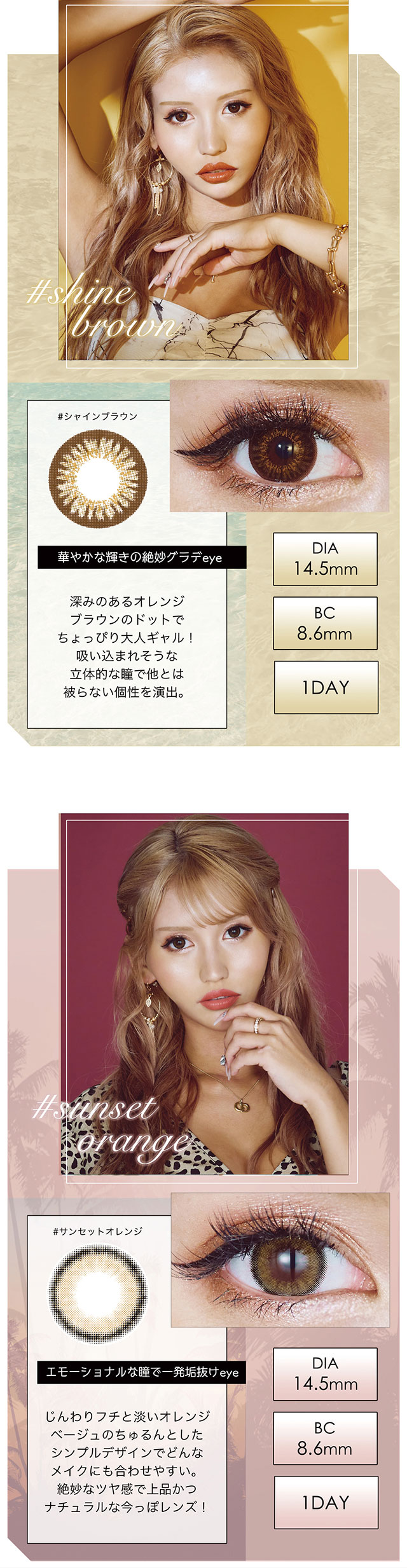 ココナッツブラウン、シャインブラウン、サンドベージュ、サンセットオレンジ
