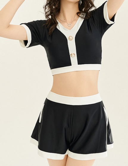 セパレート水着 フィットネス水着 半袖 ボタン 黒 夏 リゾート 海 ビーチ 温泉 プール 水泳 海水浴 バカンス ジム スポーツ 体型カバー 太もも お尻 二の腕カバー 日焼け防止 UV対策 大人可愛い キュート 10代 20代 30代 トレンド 人気