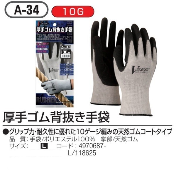 グリップ力・耐久性に優れた10ゲージ編みの天然ゴムコートタイプです。