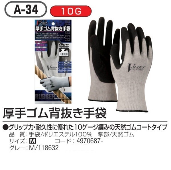 グリップ力・耐久性に優れた10ゲージ編みの天然ゴムコートタイプです。