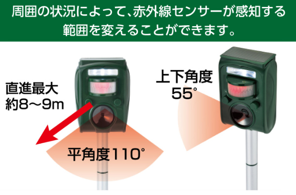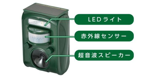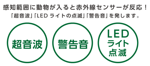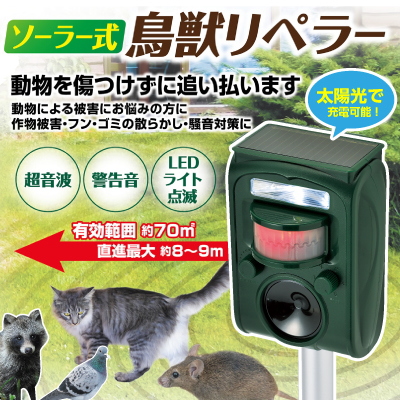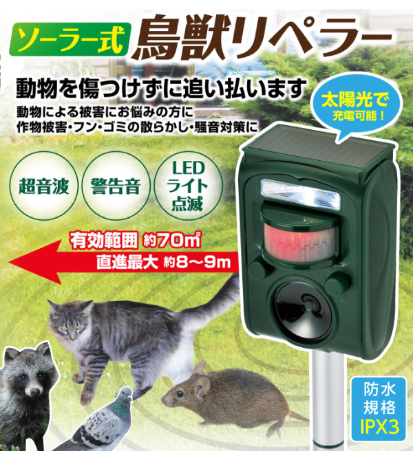 ソーラー式鳥獣リペラー 動物避け用品 害獣対策器 装置 害獣撃退器 庭 畑 果樹園 獣害対策 動物 害獣 撃退 撃退法 撃退装置 対策 夜行動物 赤外線センサー 感知 超音波 LEDライト 点滅 警報音