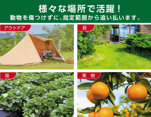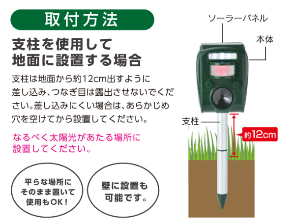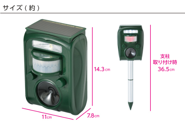 【商品サイズ(約)】11×7.8×14.3cm(支柱取り付け時の高さ36.5cm)【商品重量(約)】310g(支柱含む)【充電時間(約)】・ソーラーパネル/10時間・USBケーブル/8時間【周波数(約)】13.5kHz〜45.5kHz【赤外線センサー(約)】・平角度110度・上下角度55度【誘導距離(約)】8〜9m(動物の大きさによります)【作動時間(約)】1日(フル充電時)【防水規格】IPX3【セット内容】・本体・支柱・充電用USBケーブル【材質】ABS樹脂【保証期間】6ヶ月【生産国】中国