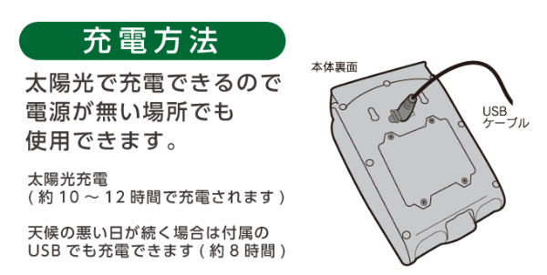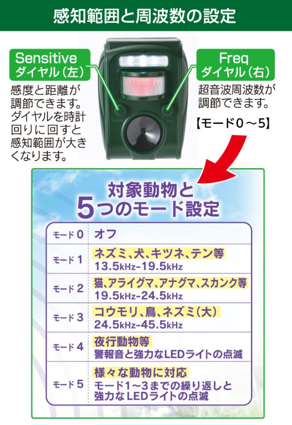 感知範囲に動物が入ると、赤外線センサーが反応し、強力な「超音波」「LEDライトの点滅」「警報音」(※ダイヤルにて選択可)を発する害獣撃退器です。不快感を与え、動物を傷つけずにこの範囲から追い払います。上部のソーラーパネルで太陽光のエネルギーを充電池に充電します。電池よりもエコで経済的です。太陽光で充電できない際も、付属のUSBケーブルで内蔵バッテリーへ直接充電もできます。動物を感知すると、赤いLEDライトが点滅します。地面に差したり、平らなところに置いたり、壁へ設置も可能ですので、より効果的な場所で使用できます。周囲の状況に合わせて、赤外線センサーが感知する範囲を調整できます。特に近づけたくない動物に合わせて超音波の周波数を切り替えられます。