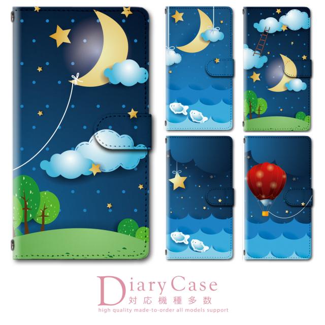 スマホケース 手帳型 多機種対応 カメラホール搭載 ストラップホール付き カード収納 ベルト付き かわいい ポップ 夜空 星空 三日月 気球 バルーン スター 夜モチーフ 夢 絵本 カワイイ 可愛い 手帳型スマホケース 手帳型ケース 手帖型 てちょう 全機種対応