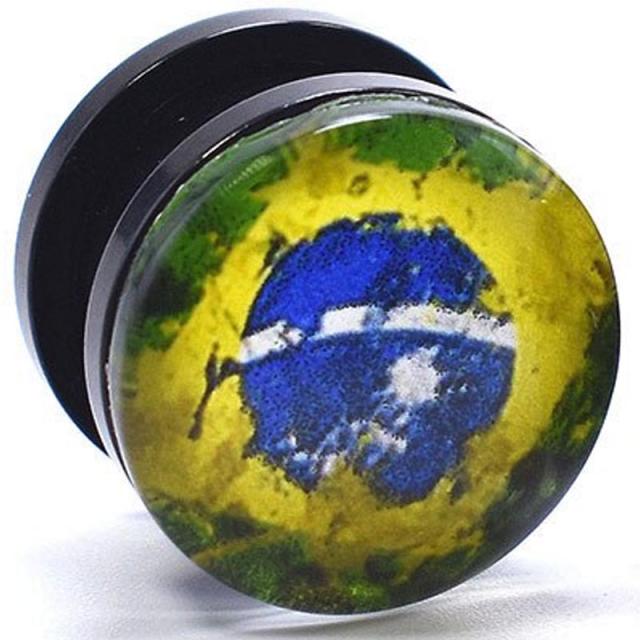 黒色ブラックのステンレス製のトンネル型ボディピアスにサッカー王国、南米ブラジルの旗をデザインしたおしゃれなホールプラグ。